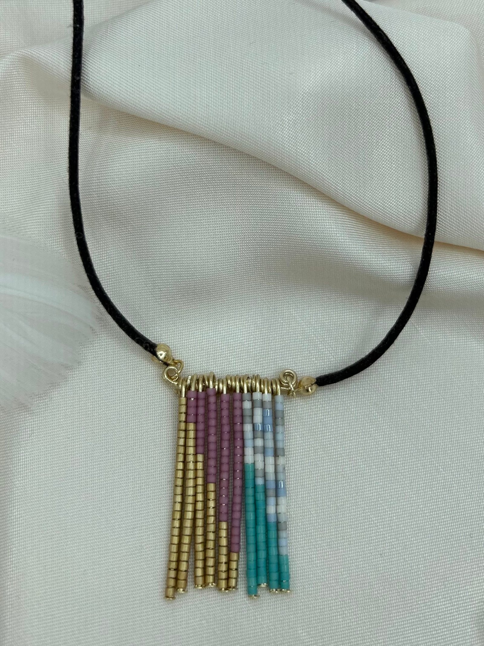 El Collar Cascada Miyuki está diseñado para quienes disfrutan de los detalles llenos de color pero con un diseño limpio. La gargantilla está formada por un cordón negro suave (sin cuero), muy cómodo de llevar y fácil de adaptar a distintos estilos.